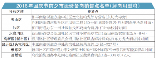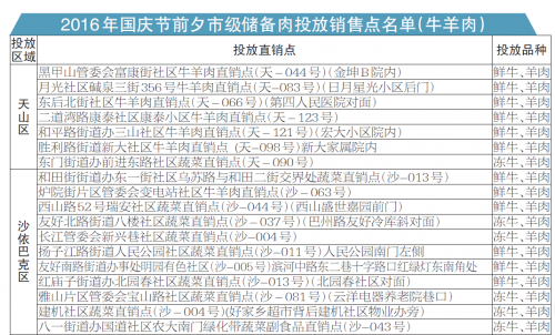至此,乌鲁木齐市将有71个投放点投放鲜体羊肉、鲜体牛肉、冻体羊肉、冻体牛肉、冻体猪肉精瘦肉、冻体猪肉白条、鲜肉用型鸡肉。(详细地址见表格)