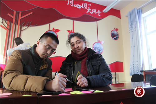 伴着歌声,一幅幅充满喜庆、吉祥、团结的鲜红春联在结亲对子的手上传递。拿到春联的少数民族居民激动与自己的结亲对子分享喜悦,共读春联并释义。结亲对子们纷纷送上新春祝福,有的将祝福共同写在纸上,有的一起合拍小视频送祝福,将民族团结一家亲氛围推向高潮,“过年好”的祝福声在大厅回荡。结对“亲戚”乌布力大叔说:“这次活动特别有意义,不仅让我了解了春节的由来,贴春联的方法,还在活动中增进了彼此的感情。希望街道以后能多组织这样的与民同乐活动,让我们的民族团结主题活动更加丰富多彩。”