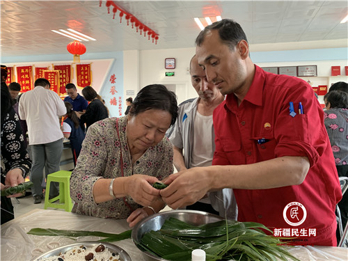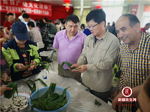 活动中,各族干部群众“大显身手”,乌买尔·奴尔和他的亲戚史胜波在听取了包粽子技巧后,开展了竞赛,看谁能在最短时间里能将粽子包的又快又好,只见他们将粽叶叠好,把糯米放进粽叶里,还放入准备好的红枣、红豆等配料,随后用力将糯米及配料压紧,最后用线在粽子外绕几圈,在欢声笑语中,一个个粽子包好了,成绩不分上下。