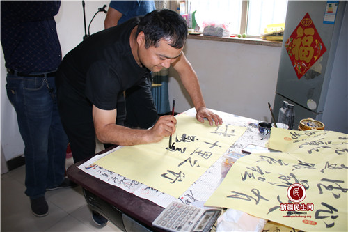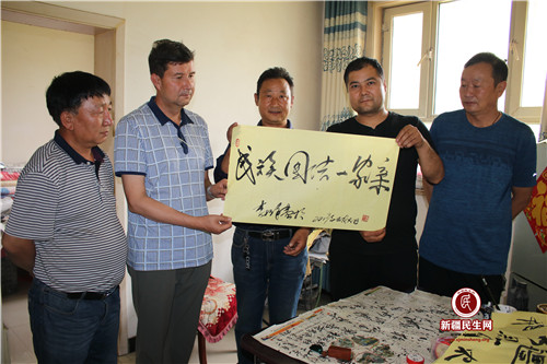 “我特别感动工作队和我一同过端午节,感谢工作队像亲人一样待我,感谢党和政府这些年给我们的关心和关爱。中华文化博大精深,传下了很多国粹,而我最喜欢的一样,就是写毛笔字,我写几个毛笔字送给我的亲戚做个纪念。”李松年说完,便拿起了毛笔,在稿纸上写着“民族团结一家亲”,并签字盖章后送给了亲戚艾尼瓦尔·阿不都热依木。工作队队员争先恐后的也拿起了毛笔,认真的练起了毛笔字来。