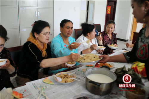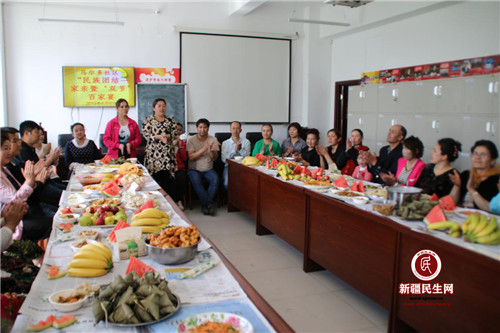 居民们纷纷大显身手,做出了自己的拿手好菜,联谊会现场飘着肉香、果香、粽香,亲戚们与结亲干部唠着家常,话着团结。社区第一书记崔江民为亲戚们讲解了端午节的由来。欢乐的麦西莱普音乐中,大家载歌载舞,意犹未尽。活动最后,大家共同评选出了此次活动最受欢迎的几种菜品,由社区干部颁发奖品。