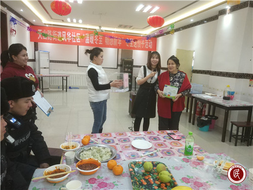 新疆民生网(迪丽斯坦 李曼桐)“冬至吃饺子”一直是中华民族传统习俗。好吃不过饺子,温暖不过集体。为丰富辖区居民群众文化生活,增强邻里之情,让大家过一个快乐而温馨的节日。风华社区2018年12月21日上午在居民活动室举办“温暖冬至 畅想新年”冬至送饺子活动。风华社区工作人员、访惠聚工作队队员、服务基层干部及辖区居民50余人参加。