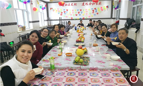 上午11时30分,活动正式开始。山东商会带着温暖的情谊为风华社区工作队及社区工作人员送来了三箱饺子,为大家带来了节日的问候,并让前来参加的叔叔阿姨们提前吃上了热腾腾的饺子。在品尝完山东商会送来的饺子之后,大家开始动手自己包饺子。和面、擀饺子皮、拌饺子馅,大家在欢乐的笑声中彼此相互配合着,暖暖的情谊充溢着整间屋子。吃着饺子不忘宣传传统文化,仅仅10道问答题,就让居民们充分了解冬至的来历及背后的意义。尼亚孜布维阿姨吃着饺子,答着题,不一会就已收获满满。上台发表获奖感言时很是激动,表示很感谢社区的关心,寒冷的冬天还记着他们,感谢党和政府送来的温暖。