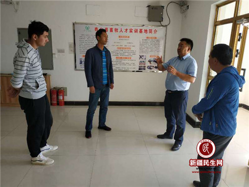图为:在奇台县畜牧人才实训基地听工作人员介绍