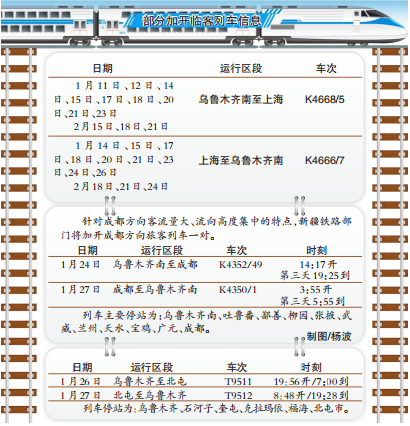 为了确保旅客顺利返乡,乌鲁木齐铁路局在上海、汉口、成都、重庆、郑州等客流集中方向加开临客列车12对。其中包括乌鲁木齐南至上海K4668/5K4666/7次、成都至奎屯K4350/1K4352/49次、重庆北至乌鲁木齐南K4332/3K4334/1次、郑州至乌鲁木齐南3027/8次、成都至乌鲁木齐南K4348/5K4346/7次、汉口至乌鲁木齐南3902/33904/1次、郑州至乌鲁木齐南3927/8次等临客列车。