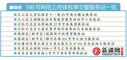 新疆网讯(记者彭芳 通讯员陈天才)即日起,乌鲁木齐9处交管服务站开通体检报告单网络上传业务,这意味着驾驶证期满换证、超龄换证(持有A、B照的驾驶人若超过60岁须降级为C1)、70岁以上驾驶人年度体检这三项业务的办理可不用再经历排队。