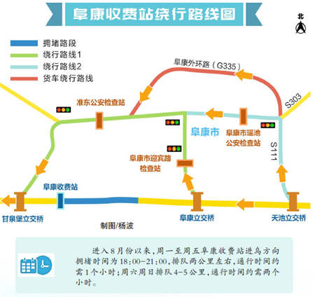 进入8月份以来,周一至周五阜康收费站进乌方向拥堵时间为18:00-21:00,排队两公里左右,通行时间约需1个小时;周六周日排队4-5公里,通行时间约需两个小时。