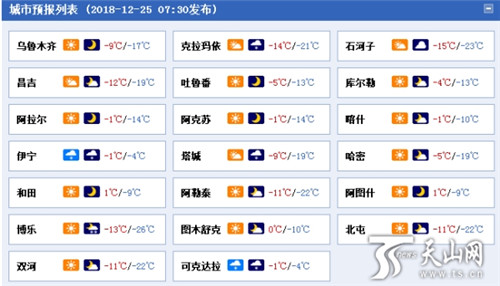 12月25日夜间至26日白天,伊犁州、博尔塔拉蒙古自治州、塔城地区、阿勒泰地区的部分区域有微到小雪,其中伊犁州局部区域中到大雪。全疆其它地区晴有时多云,风力不大。