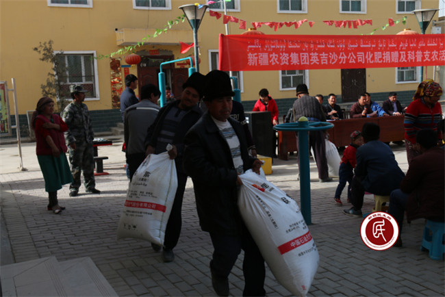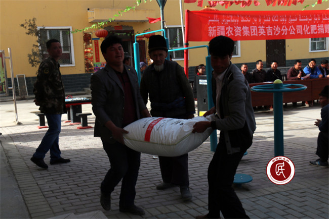 3月24日清晨,19村的受赠村民来到村委会,期待着领取 “爱心”帮扶化肥。当装有化肥的货车缓缓开进村委会大院内,工作组成员、村委会干部齐上阵,忙着卸化肥并摆放整齐。村民们兴高采烈,大院内热闹非凡,村民称赞工作组和村“两委”为大家办了一件大好事、大实事。捐赠仪式上,新疆农资集团英吉沙分公司经理苏进宝说:“为农民朋友办点实实在在的事情,为脱贫攻坚尽一份力,是我们公司应尽的责任和义务,希望广大农民朋友早日实现脱贫致富。”