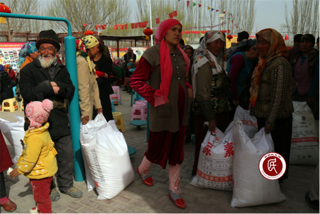 萨罕乡19村“四老人员”、党员和困难户等村民代表在化肥捐赠仪式现场领到了“爱心”化肥