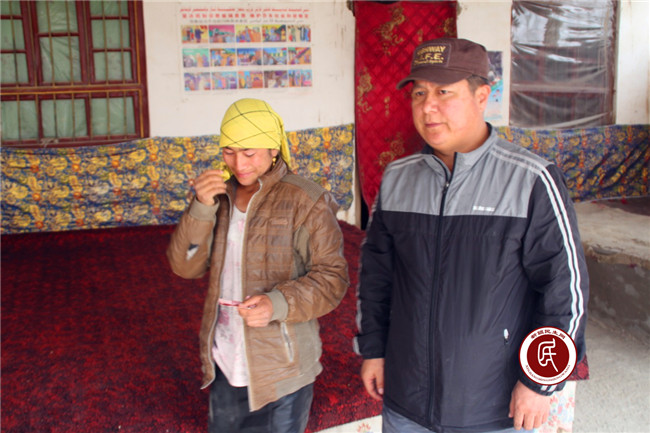 在特贫户麦麦提斯迪克·玉苏普家走访时,得知其妻子萨拉买提·图尔荪因病家里面没有现金去看病时,该户联系人艾尼·赛提当场掏出200元,让她赶快去看病,萨拉买提感动的流出了泪水。