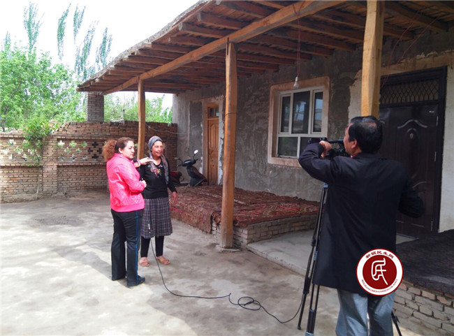 (图为新疆电视台记者采访加依铁热克村党支部书记阿不都热合曼同志)