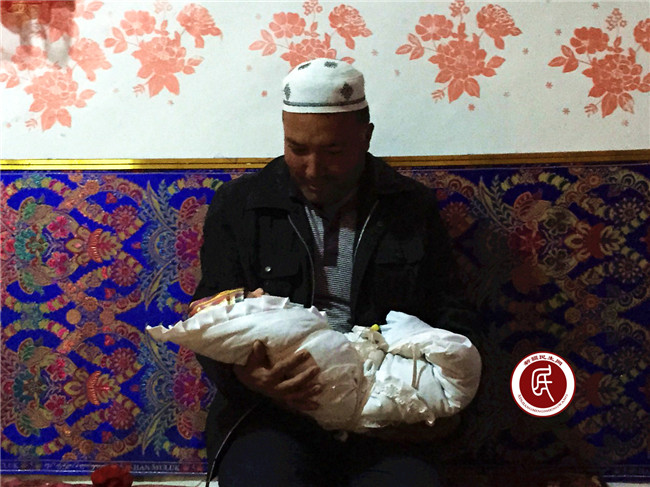 看到工作组的同志们到来,艾海麦特高兴的迎了上来同工作组成员握手问好,让大家一下就感受到了主人家的热情和纯朴。按照维吾尔族新生儿取名的习俗,孩子出生三天或七天,就要举办命名仪式,父母会邀请有声望的人或者长辈为孩子起名,艾海麦特的孩子的起名者就是孩子的爷爷。在艾海麦特孩子的起名仪式上,大家用完便餐后,主人家将包裹在漂亮襁褓中的孩子交给爷爷,爷爷对着孩子的右耳念段艾赞(给婴儿命名时诵读的祈祷文),对着左耳说声“你的名字就叫阿利亚·艾海麦特”,然后将孩子搁在毛毡上慢慢翻几个滚儿,孩子被震动得惊叫哭了起来,这时我们都从肃穆的仪式中回转到欢迎小生命的喜悦中。