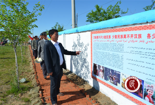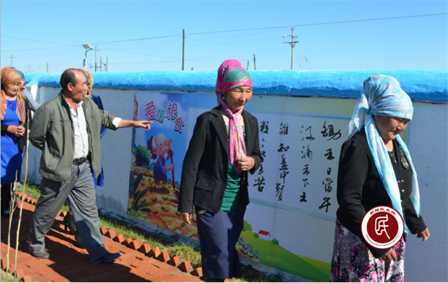 “民族团结”“正能量”“去极端化”“哈萨克民俗”等文化上墙,是“村两委”与工作组确定的二马场新村建设的内容之一。一幅幅浅显易懂的宣传画,一条条简洁明了的标语,给广大党员干部和群众营造了主题鲜明、通俗易懂的文化氛围,让他们在潜移默化中树立自律意识,让民族团结”“正能量”“去极端化”入脑如心。
