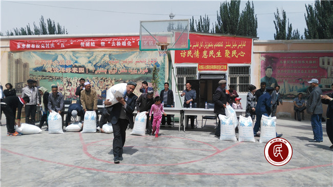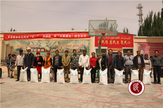 新疆民生网讯 4月30日,乌恰县人社局住村工作组联合村委会开展迎“五·一”促团结 暨“去极端化”文体活动,人社局免费为村民发放了8吨化肥,1吨面粉,对口帮扶单位中国人民银行也送来了面粉和清油。