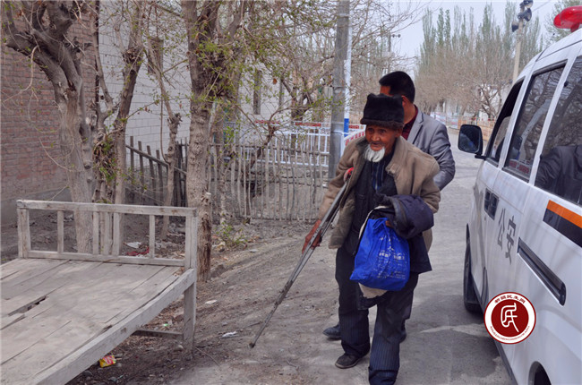 村干部为吐尼牙孜•阿西木老人换衣服、收拾行囊,准备回家