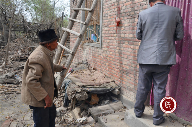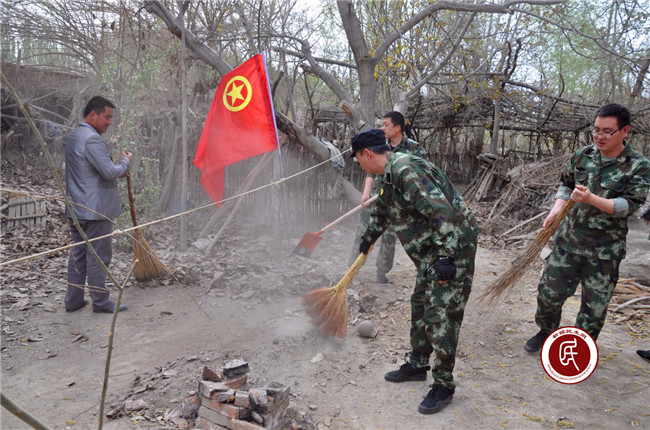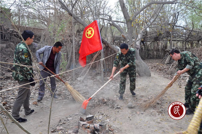 看到老人家徒四壁,满目疮痍的情景,工作组成员感同身受、心灵震撼,希望用实际行动力所能及的为老人做点实事。说做就做,工作组的小伙子们拿起扫帚、铁锹来到老人家,在尘土飞扬中,整理院落和房间,挥舞扫帚、清理杂物,挥洒的汗水与灰尘凝结在一起,这一幕幕场景老人都看在眼里,记在心里。临走时,老人紧握着工作组小伙子们的手,动情的说:“热汗买提!!”(感谢你们!)
