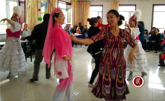 深受感染的居民,在现场找到自己的不同民族邻居,主动结成好邻里,他们还互相教学日常问候语,用维吾尔语和哈萨克语大声朗读“我爱昌吉、我更爱我的祖国”等文明礼貌用语,现场气氛和谐浓郁。