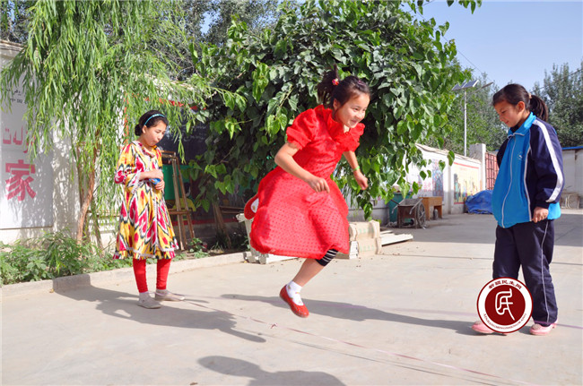 汉族孩子和维吾尔族孩子在一起跳皮筋