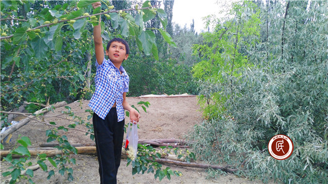 最令我感动的是,在一家村民门口的树上摘桑葚。这家大一点的女孩看到我在摘,出来后一句话没说就默默上到树上摘了起来,摘得小手拿不住了就递给我。但是没过多久,她就进到院子里了,又出来站到树上时,看到鼻子里塞的纸才知道原来刚刚她流鼻血了。紧跟着她出来的还有三个小孩,大概三四岁左右,我就把自己摘的桑葚给他们每人分了一把,后面边摘边给他们吃。一个3岁的小巴郎在矮的地方摘着,摘了几个便要把手里的给我,我说你自己吃。孩子这小小的举动让我深受感动,走时,我对他们说:“或西(再见),热合买特(谢谢)!”大一点的巴郎也回说:“或西(再见)。”走了一段路后,听到后面有个声音一直在,我回头一看,原来他一直朝着我走的方向边挥着手边说或西(再见)。我也朝他挥挥手,说了句或西(再见),此时感觉自己的眼睛湿润了。