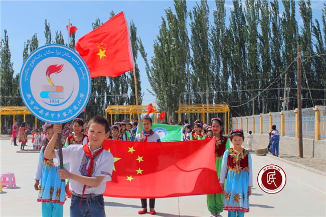 上午的阳光格外明媚,赛喀甫村的文化大舞台,国旗飘扬,彩旗舞动,伴着嘹亮的少先队队歌,赛喀甫村小学的孩子们和双语幼儿园的孩子们在老师们的带领下精神抖擞、朝气蓬勃的列队走来。