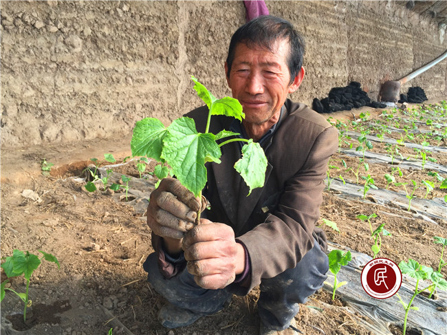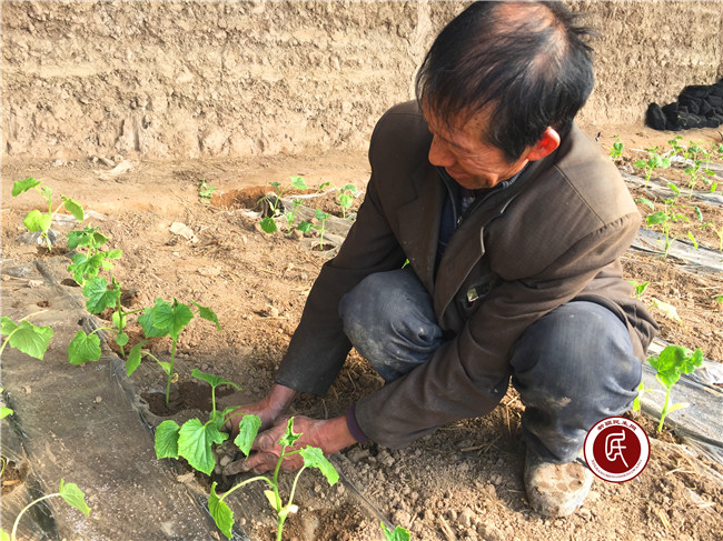 在走访入户时,二区裴汉华大伯的一双手把我震住了。见到裴大伯的时候他正在和妻子给黄瓜补苗,他的那双手让我久久不能平静。那双手像老葡萄藤条一样干硬,骨节明显突出,手指严重变形。深深的龟裂纹里全是泥巴,包括指甲缝里都被泥巴填的满满的,手心凸起的老茧也排成了两排。整个手看起来像长满结疤的老树根,又像是生满锈的旧铁耙,更让我揪心的是,他的左手还没有大拇指。带着好奇和敬佩的心情,我决定对他家进行“跟踪式”的技术指导服务,我想知道他是怎么通过一双残疾的手走上致富道路的。