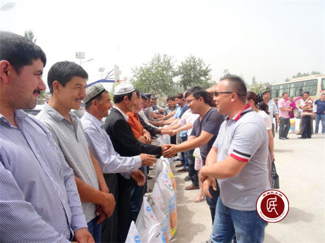 图为克州人社局干部们为亲人送上面粉与慰问金
