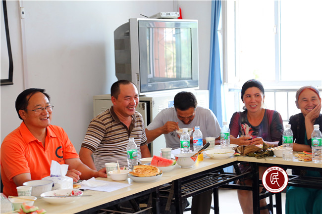 大块朵颐之后,一位维吾尔族党员老大妈站了起来,说道:“我的父亲是党员,我也是一名有着35年党龄的老党员,我的儿子艾买尔·买买提也是党员,他还是我们村的会计,我很欣慰他能跟着党走,配合工作组踏踏实实地为村里的老百姓做一些好事。今天我们和工作组的同志们还有村里的汉族同胞们一起在这里度过咱们中国的传统节日——端午节,我们都是中国人,这是我们共同的节日,我衷心祝福大家节日快乐!”