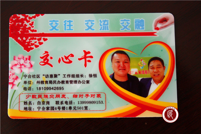 小小的一张“交心卡”,承载的是宁合社区“访惠聚”工作组与社区群众结对子互助的真心和诚心,更是务实的工作作风、认真履职尽责的决心和信心。凡是收到交心低保户、弱势群体都是“一对一”交心,这些卡片也将架起居民和工作组的连心桥,真正解决大伙的难题和心事儿。