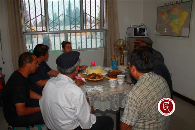 忙乎了半天,赛喀甫大盘鸡、羊肉炒菜、凉拌粉条等富有本地特色的家常菜和自治区发改委住村工作队为每位过生日的工作组成员配送的生日蛋糕摆上了桌子,正当大家准备开餐庆祝时,村支书吾普尔、村“两委”班子成员、村警务长塔也尔和村协警也敲门进来了,原来他们听说今天是工作组热娜大姐的生日,特意拎着刚出炉的大馕代表村里的父老乡亲前来祝福生日快乐,给了大家突然的惊喜。