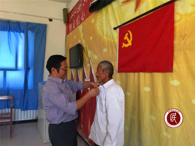 老党员卡迪尔·穆萨因为腿脚不好,由村干部扶着来到党旗前与党旗合影。已经入党50余年的卡迪尔告诉工作组,他亲眼见证了最近三年村里的变化之大,如今村里道路建好了、渠修好了、村委大院漂亮了,他感到在党的正确指引下,村里建设发展的步伐越来越快,让好多外出打工回来的人都认不得了。
