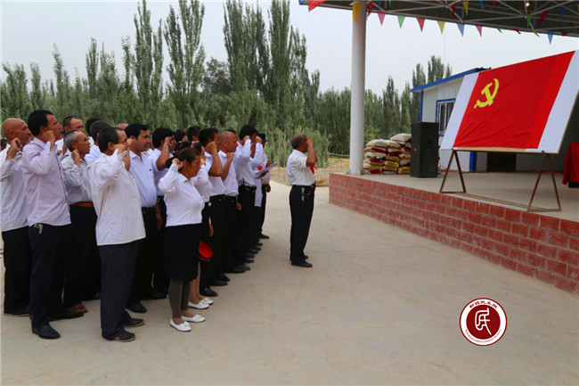 鲜红的党旗前,住村工作组组长潘红炜和住村临时党支部的党员们举起了右拳,潘红炜组长领誓,“我志愿加入中国共产党,……”,用庄重、洪亮的誓言给村里的党员们做了楷模。随后,村里的3名预备党员和全体老党员在村党支部书记塞麦尔·赫则木的领誓下,分别立下了誓言、重温了誓词,再次表达了对党的忠诚,再次领受了党的责任和使命。“没有共产党,就没有新中国”,长期以来,村里的党员们艰苦奋斗,无私奉献,为村集体的稳定、发展、和谐作出了艰辛的努力。