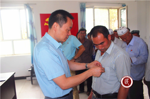 戴党徽,树形象。工作组临时党支部为村全体党员佩戴党徽,使每位党员时刻牢记自己是一名共产党员,增强荣誉感和党员意识,时刻处于广大群众监督之下,增强自律意识。