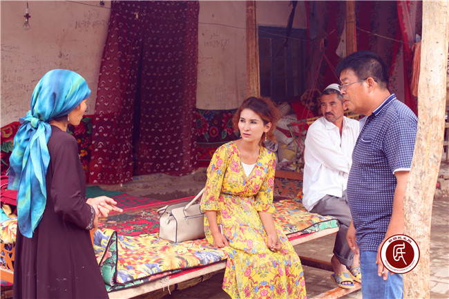 图:村民如则•依斯热依力与工作组、村干部来到依夏古丽•阿西木家劝说她做手术