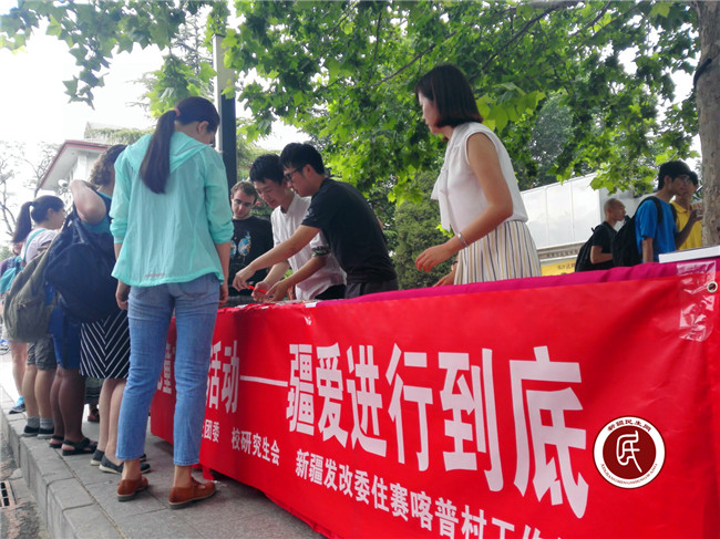 在自治区发改委住村工作组和北京师范大学双方的积极筹划下,一场“疆爱进行到底”的爱心募捐活动通过北京师范大学校团委、校研究生会组织在北师大校园内开展。