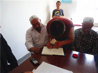 (图为在村监督委员会的监督下签字领取土地出让款)