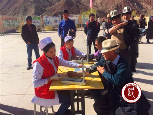 爱心医务人员为村民免费测量血压,向群众奉献自己的微薄之力