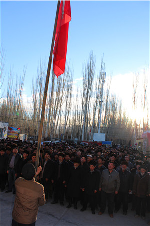 升国旗仪式结束后,驻村工作队队长亚力坤·卡的尔说:“通过升国旗把村民集中起来,宣传讲解党的方针政策、进行农业技术的培训,村干部和工作队给农民安排工作,把全村的村务公开,征求村民的意见,加深了与群众的关系,同时也加强了‘两委’班子的凝聚力、战斗力。 ”