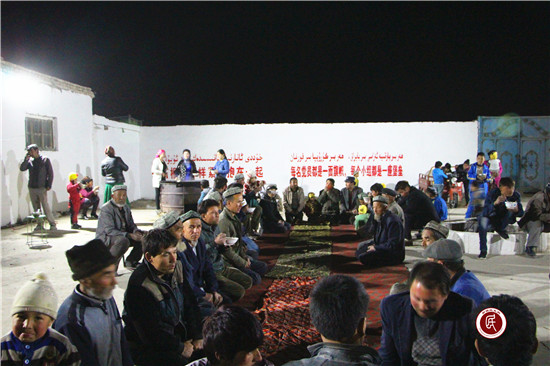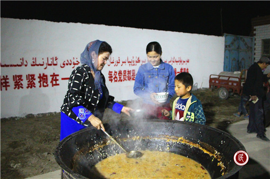 活动中,工作队员与村民在活动中心院子中间的地毯上盘腿而坐,共同品尝着用各家各户剩余的豆类、干果和碎肉熬制成的“诺如孜饭”。咸香可口的诺如孜饭,赢得了工作队员连连称赞:“好吃,好吃,味道太好了!”