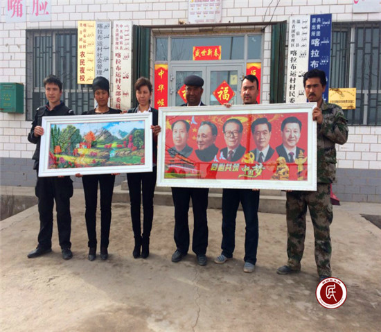 新疆民生网讯 (通讯员 麦合木提·木提拉 ) 4月2日上午,温宿县喀拉布运村村民吐尔荪、艾买尔·阿巴拜克日夫妇,带着自己亲手制作的两副十字绣工艺牌匾来到喀拉布运村村委会,当即将一副印有“同心共筑中国梦”和 5任国家主席图像的牌匾送到驻村工作队和“村两委”干部的手上,把另一幅印着美丽家园风景画的牌匾送到村警手中,以表达对温宿县财政局驻村工作队和“村两委”干部的感谢,以及对村警日夜守护村民安全的感恩之情。