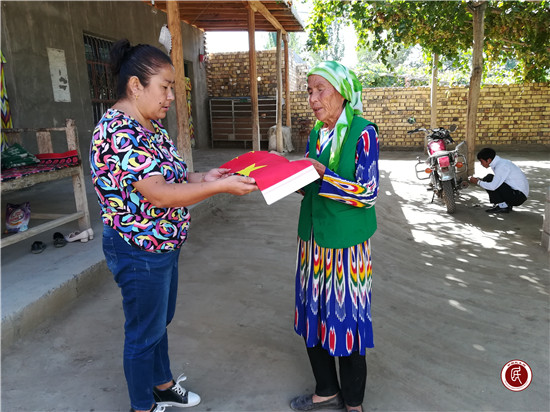 新疆民生网讯(通讯员 贾东亮) 9月22日上午,沙雅县司法局驻塔什墩村工作队结合常态化入户走访,开展了“送国旗挂国旗迎国庆喜迎十九大”活动,全村227户群众都免费领到了国旗和旗杆。