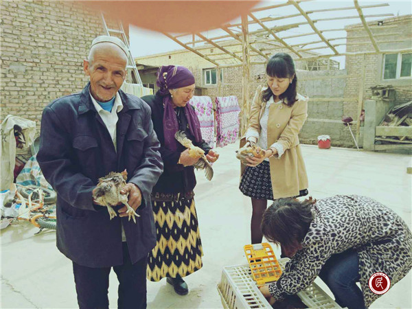 在吾甫尔·吐米尔、屯萨罕·普拉提等4户贫困户家中,村民们满心欢喜地在帮扶干部们手中领取鸡苗。“感谢广播电视中心干部,给我送来这30只鸡苗,我一定会养好这批鸡苗,提高家庭收入。”萨依巴格村的贫困户吾甫尔·吐米尔在领取鸡苗后说。