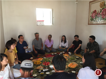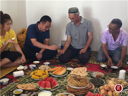 葡萄、馓子、酸奶,玉米、西瓜、哈密瓜都是咱农家自种无农药化肥的绿色食品,大家盘腿入座相谈甚欢。“人才是第一资源,拜城县的发展离不开高素质的人才队伍,我们十分欢迎贵校毕业生来南疆,来拜城发展。”赵平部长热情的向客人们介绍了十八大以来我们拜城发生的翻天覆地的变化并表达了我县对人才的渴望。老师们在品尝“酸奶子”中和大家分享了阿不迪格力在学校的优异表现,并仔细询问了其家庭情况与返乡表现,当即代表学校表示将在生活和学习上给予该生最大的关怀关爱,助其顺利求学。聊到兴起,老师们还和大家玩起了维吾尔族乡间传统游戏“碰鸡蛋”,在欢声笑语中吐尔逊大叔流下了幸福的泪水:“你们来我们太开心了,感谢祖国,感谢这个好时代,yanga、yanga(多吃、多吃)”。