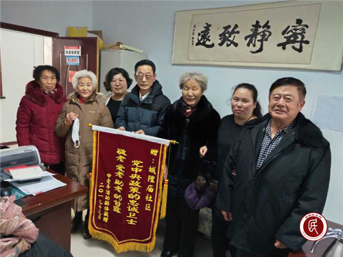 新疆民生网(武开欣)2019年元月2日,奇台县城隍庙社区出现一幕感人的场景,中老年活动群体把一面“党中央政策的忠诚卫士,敬老爱老助老的甘露”的锦旗送到了社区党支部书记严静的手中。城隍庙社区党总支书记严静在接过锦旗时深有感触地说道:“你们送锦旗是对我们工作的肯定,同时让我们看到身上所担负的责任,是我们践行好党的群众路线的巨大动力。今后我们会尽全力为辖区群众提供更多更好的服务,让辖区居民群众真正感受到社区大家庭的温暖。”