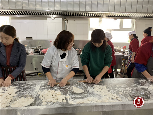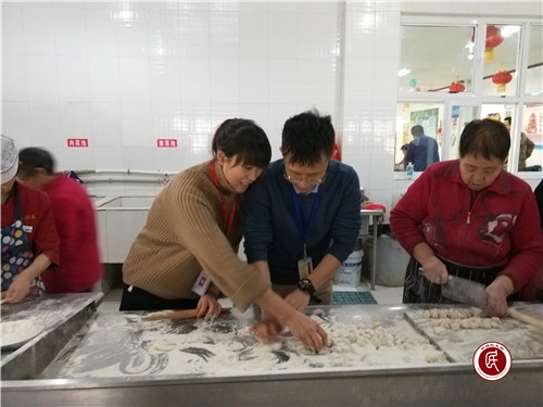 一走进为老服务中心,负责人就介绍了情况,中心有150多位老人,老人们吃一顿饺子若没有志愿者们的帮忙,厨师根本包不出来足够一顿吃的饺子。听完负责人的话,志愿者们着急了,为了让老人过年有饺子吃,立即都扎上了围裙,撸起了袖子,剁馅儿、擀皮,忙得不亦乐乎。大家围在桌前,一边说说笑笑叙着家常,一边热热闹闹地包起了饺子。