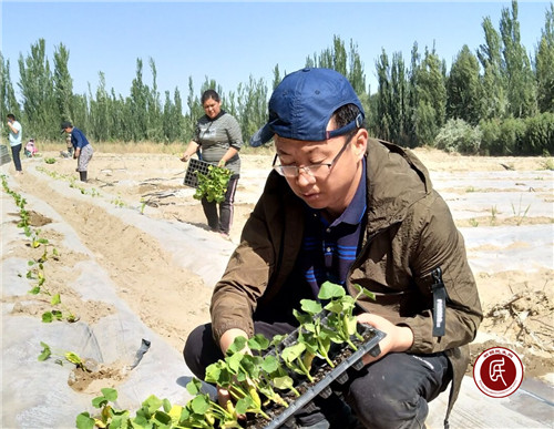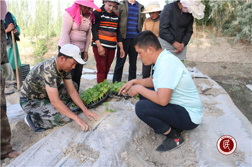 “这个新东西可以给我们带来好收入,为我们增收致富,我们很欢迎。可是小南瓜怎么种植,怎么培育,怎么栽苗我们都不会,这可难倒了我们。”1组村民布合力其·麦麦提说道。驻村工作队听到了耳朵里,更是记到了心坎上。5月7日,5名工作队成员、9名村干部、1名镇上农经站干部和部分村民早上8点30分就深入到田间地头,和村民一起种植小南瓜。驻村工作队副队长黄宗亮同志把大家聚集在一起,让种植专家和农经站的干部示范了如何挖洞、如何放苗子、如何垒土,然后结合自己的学习经验,和大家分享了种植技巧和注意事项,如挖洞的大小、深浅、距离,放苗子如何快速、怎样高效,垒土时土量多少和干湿等,都做了强调说明和实际演示,干部们和村民们听得认真、看得清晰,于是大伙争先恐后地栽起南瓜苗来。