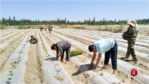 新疆民生网(王林)5月7日,走进荒地镇阔纳巴扎村1组,田间地头一派热火朝天的景象,驻村工作队、村“两委”班子、部分村民正干劲十足、争先恐后地移栽南瓜苗子。