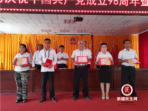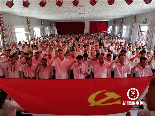 庄重的升国旗仪式结束后大会正式开始,全体起立歌唱《没有共产党就没有新中国》。“我志愿加入中国共产党,拥护党的纲领,遵守党的章程,履行党员义务,……随时准备为党和人民牺牲一切,永不叛党。”随后,全体党员和参与人员右手握拳面对鲜红的党旗再次发出铮铮誓言,通过重温入党誓词,提醒自己不忘初心,牢记使命,践行党员责任和义务,全心全意为人民服务。接着,公开表彰了阿卜杜热合曼·伊萨克等6名优秀共产党员和优秀党务工作者。