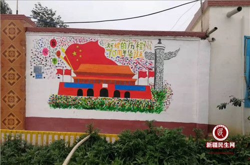 文化大院是农牧民休闲时文化娱乐的好去处,村里开展文艺活动,她们在这里载歌载舞,有时妇女在一起交流秀十字绣的方法,相互借鉴学习,同时也是村民忙里偷闲、彼此增进感情的闲暇之地,更是村里学生娃娃爱写作业的好地方。家长和孩子在这里开展亲子阅读,文化大院,给你一种文化在农家、在身边、接地气的感触。看看院内外有返乡大学为实现乡村振兴的出力的精美作品,每一笔一画都展现了大学生对家国的热爱之情,画作不显奢华。进门的右边是所有画的点睛之作,自然淳朴展现村民们对祖国成立70华诞的光辉历程的最美好的祝愿,字里行间都透露出“我爱我的国,我爱我的家”,进门左侧是富有文化底蕴的水墨画青山绿水图,更是村民向往的幽静的乡村生活。