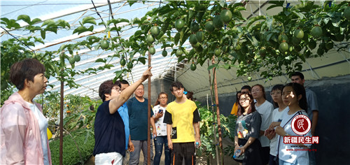 接着返乡学生兴冲冲来到人参果和百香果种植园,这两种水果如一盏盏小灯笼挂在翠枝绿叶之间,密密匝匝,缀满枝头,十分惊艳。一路参观下来,学生们仔细听着张运华介绍这些南方水果生长的环境及相关习性,同时也体验了他们劳动的艰辛。大家认真地看,认真地记,深刻感受家乡现代农业技术的先进,不仅带动了乡村旅游,还增加了农民收入。